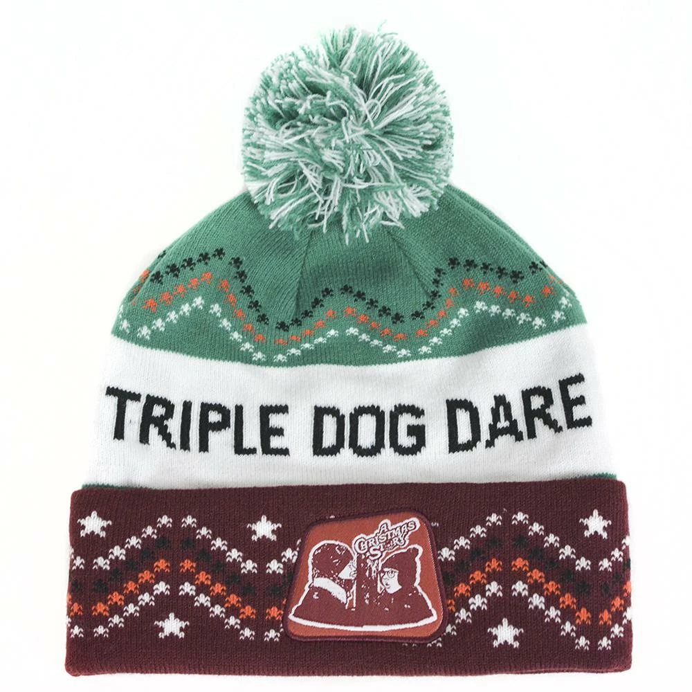 I Triple Dog Dare Ya!ย Schwartz created a slight breach of etiquette by skipping the triple dare and going right for the throat!ย Be prepared this cold season with this Triple Dog Dare Pom Beanie. Featuring a classic ugly sweater pattern includingย the memorable Triple Dog Dare patch andย quote along the front and topped with a green pom-pom.ย One size fits most.ย